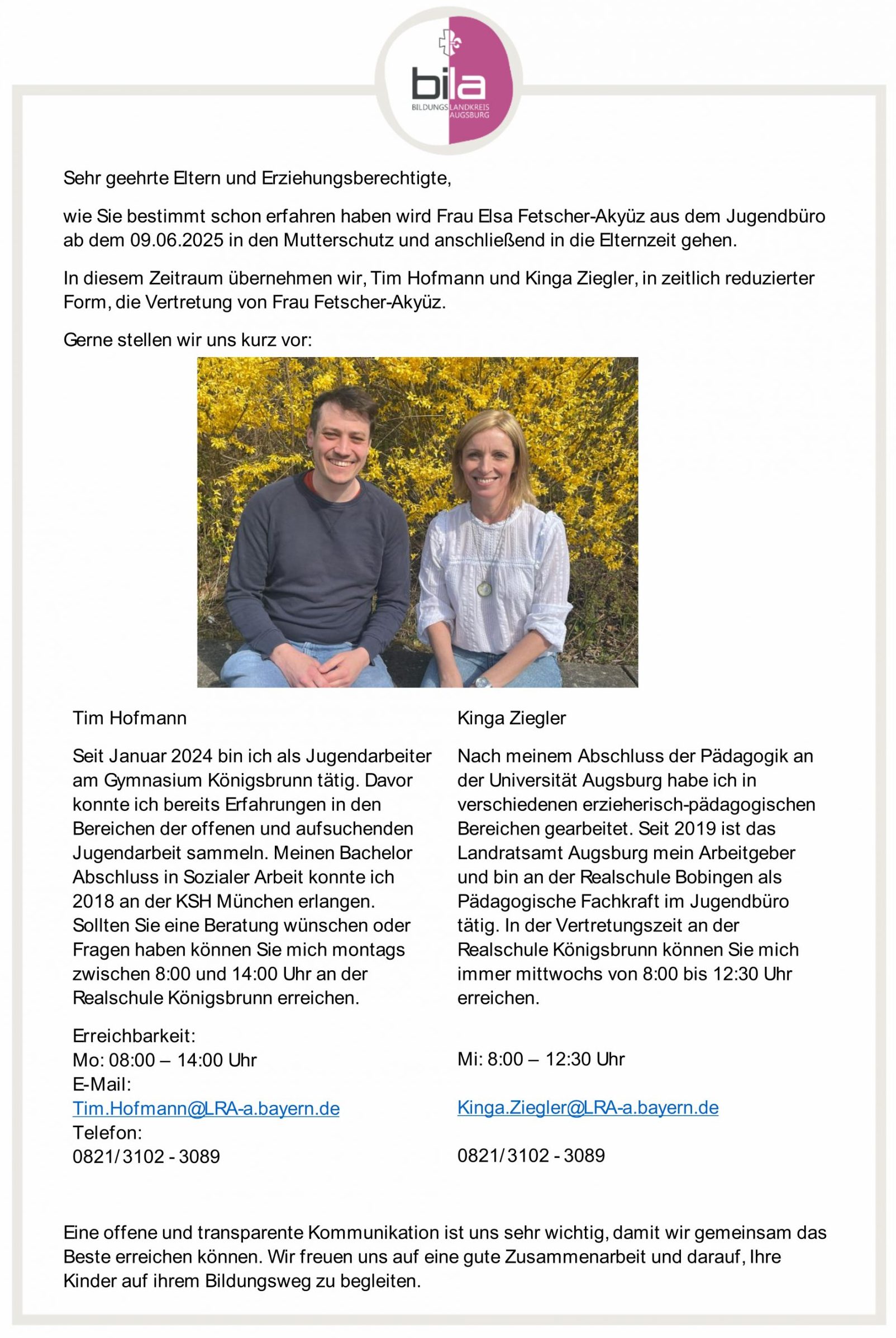 Wir bieten an zwei Tagen in der Woche Beratung an. Diese sind kostenlos und unterliegen der Schweigepflicht. Herr Hofmann ist an restlichen Tagen der Woche am Gymnasium Königsbrunn tätig, und Frau Ziegler an der Realschule Bobingen.