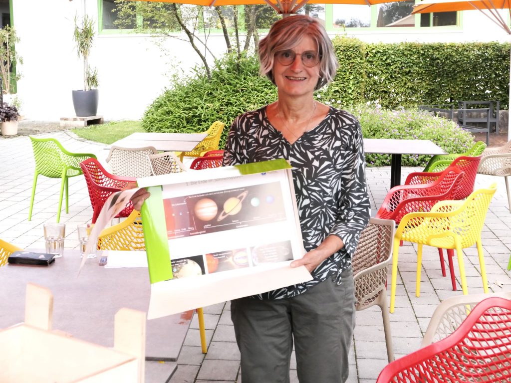 BU: Claudia Schneider, Leiterin der Dachauer DiCV-Werkstätten für Men-schen mit Beeinträchtigungen zeigt das begleitende Infomaterial des Klima-koffers