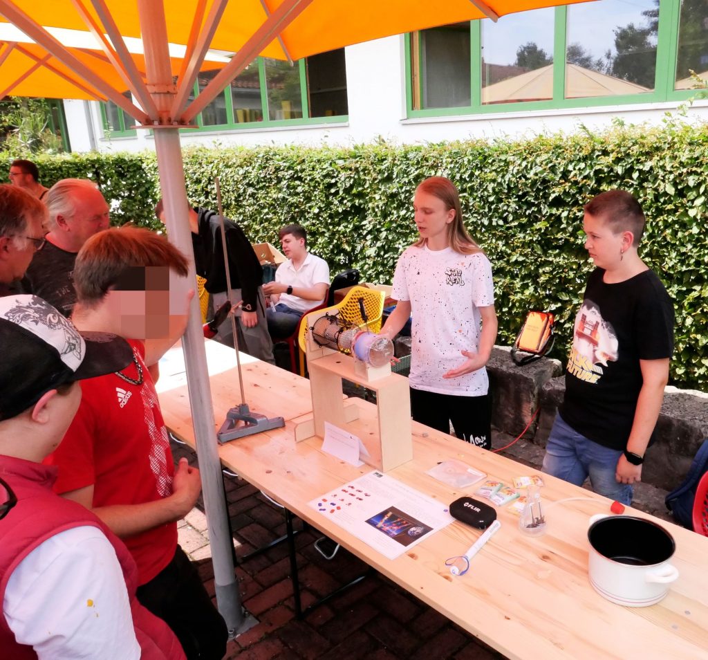 Nahezu alle Abteilungen der Dachauer Werkstätten sind mit unterschiedlichsten Arbeitsschritten an der Produktion des Klimakoffers beteiligt. Durch die 22 Mädchen und Buben und deren Lehrerin Julia Richter hatten die Mitarbeitenden jedoch nun erstmals Gelegenheit, den Koffer – und damit das Ergebnis ihrer Arbeit – in Aktion zu erleben. Nach einem Rundgang in den Werkstätten wurden alle Experimente im Innenhof aufgebaut und vorgeführt. Die Jugendlichen präsentierten sich hier als Lehrende und freuten sich über das rege Interesse und das positive Feedback.